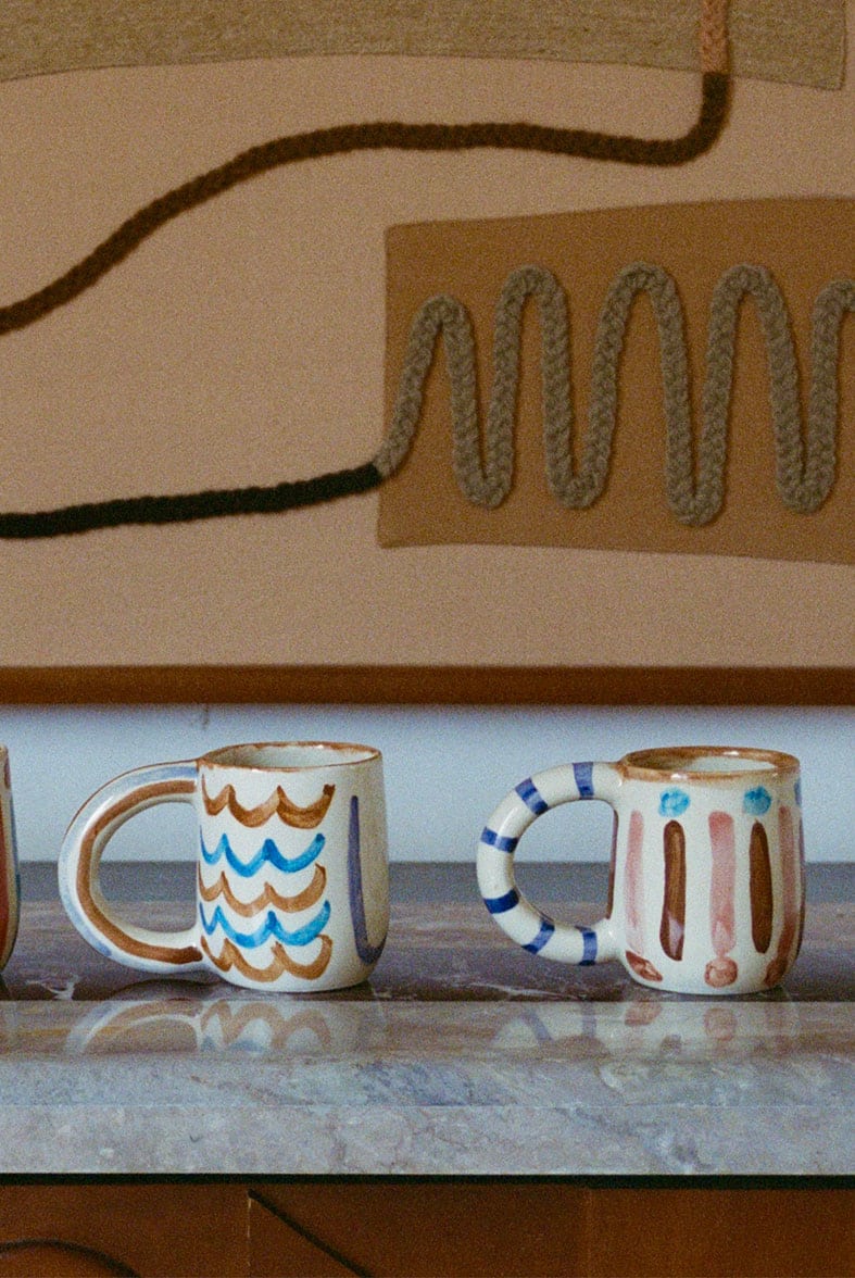 Our ceramic cups are hand-drawn by Laurence using pigment, carving tools, and pastels. The shapes are designed by LRNCE and made from terracotta clay by local artisans. As they are 100% handmade, each cup is slightly different and unique.