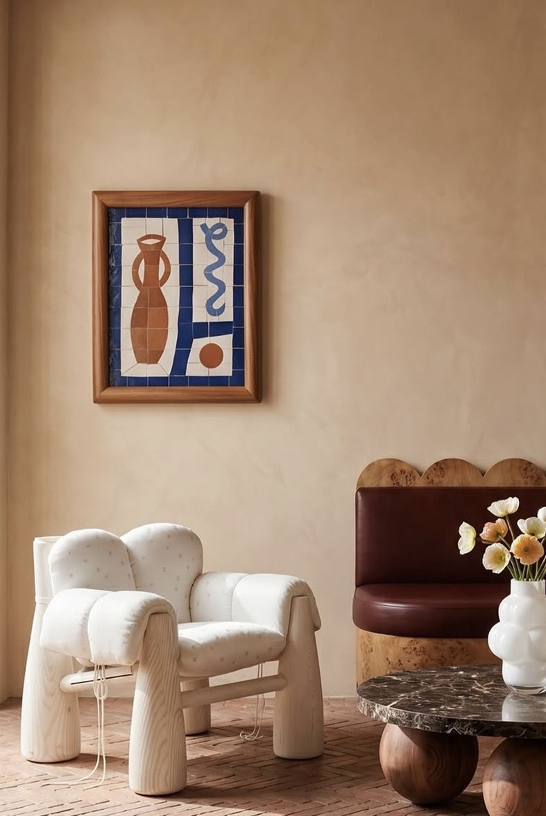 Clay tiles with a mahogany frame. Refer to our care page for more information.